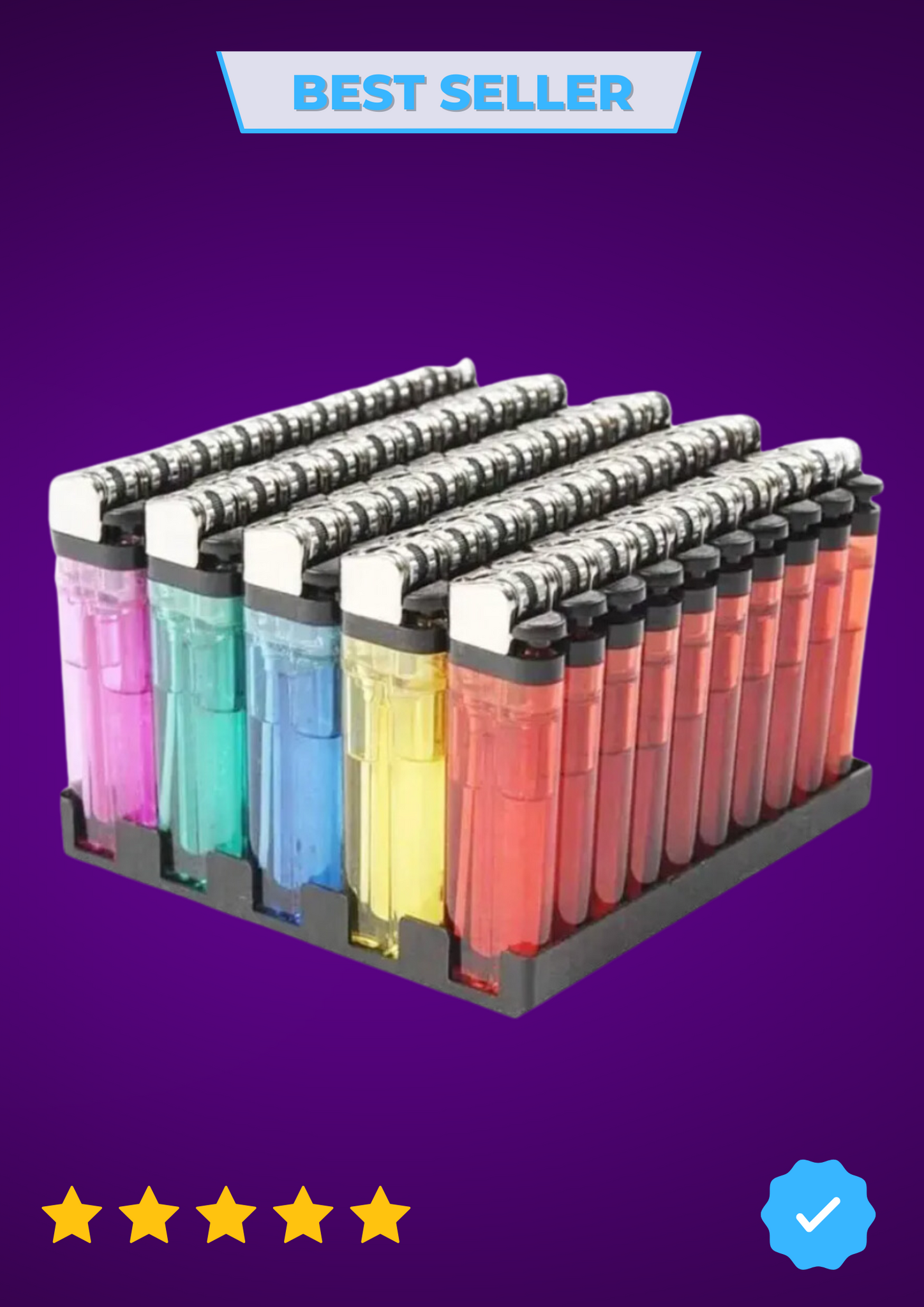 Offrez-vous ces briquets au rapport qualité/prix imbattable ! Chaque boite contient 50 briquets de 5 couleurs différentes. Très sobre, leur format vous permettra de les emmener partout avec vous ! Ils sont en plus très robustes, disposent d'un allumage à pierre très efficace ! Efficacité redoutable, prix serré, n'hésitez-plus !